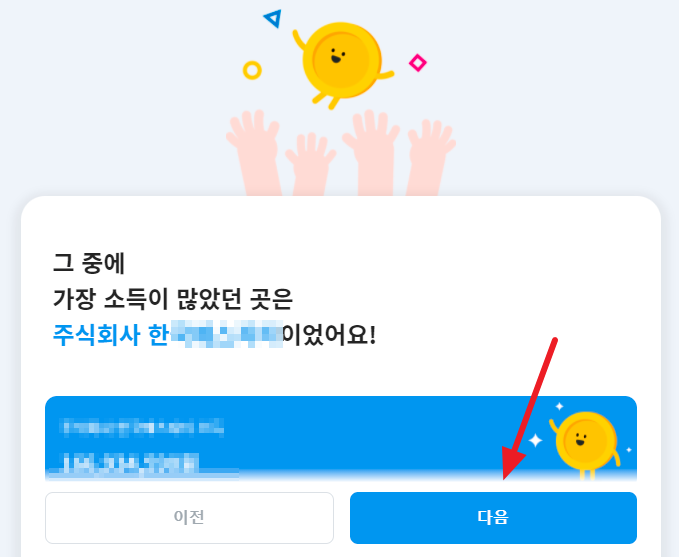 동의를 하고 잠시 기다리시면 조회가 끝나고 "조회 결과 확인하기"를 누르면 5년간 본인의 소득과 가장 소득이 많이 있었던 곳, 납부한 세금 총액이 나오게 됩니다.