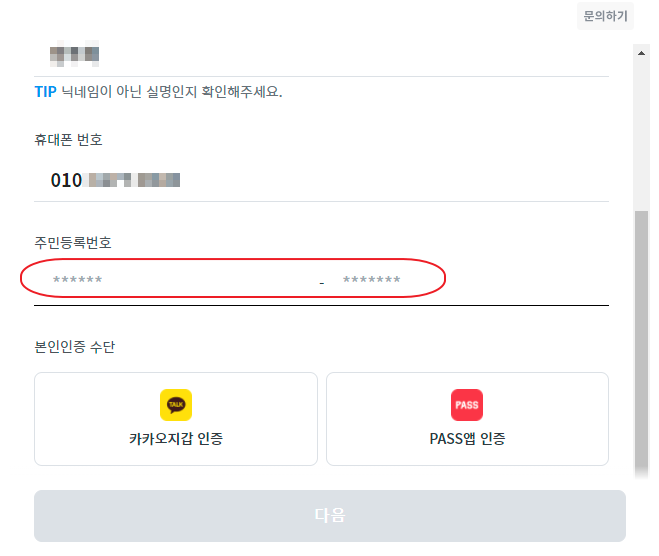 로그인을 완료하였다면 자동으로 본인 휴대폰, 주민등록번호 앞자리가 나옵니다. 뒷자리를 입력 후 화면을 아래로 서 본인인증 수단를 선택 후 진행하시고 다음 버튼을 클릭합니다.