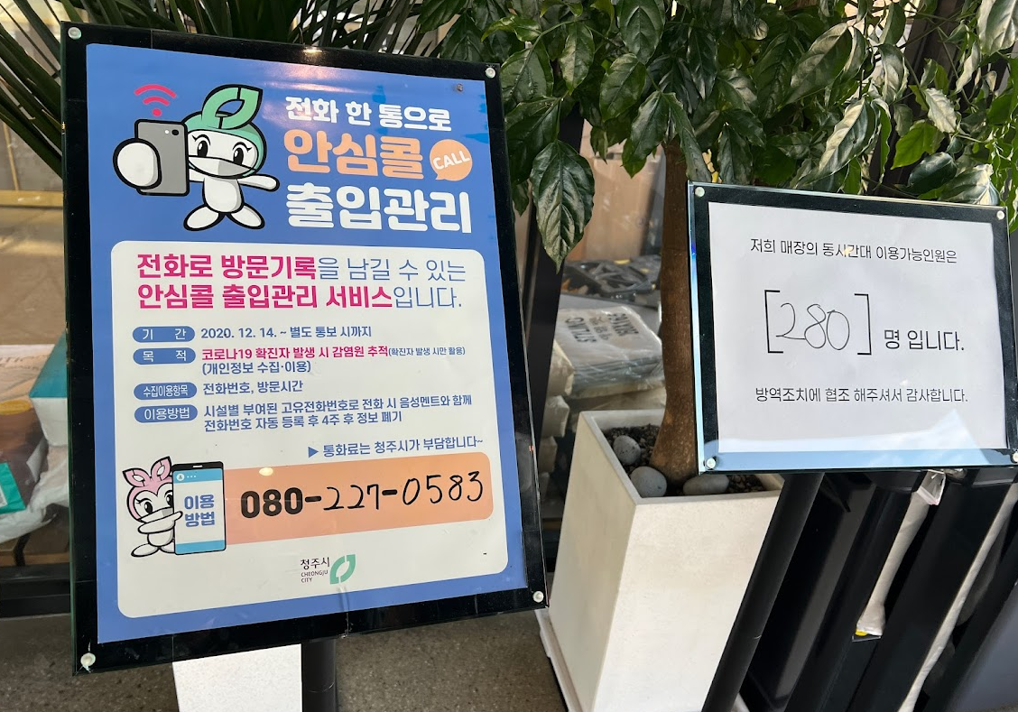 입구에는 안심콜 번호와 매장의 동시간대 이용 가능인원이 280명이라고 쓰여있습니다.