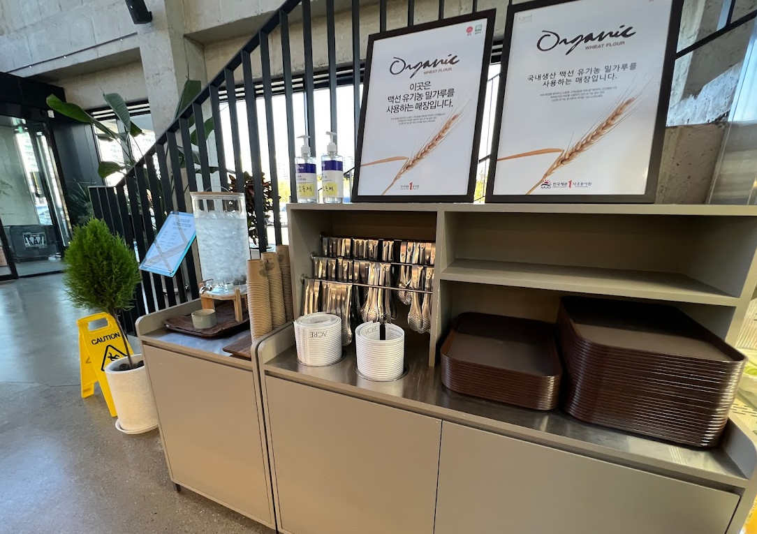 빵을 만드는 재료가 유기농이라고 강조하는 팻말이 보입니다. "이곳은 맥선 유기농 밀가루를 사용하는 매장입니다" 맥선 유기농 밀가루를 Wheat Flour이라고 하는군요.
