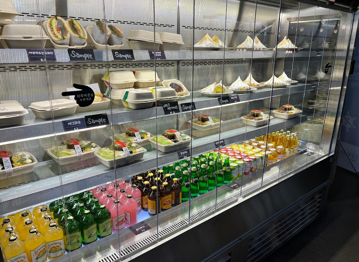 바로 옆에 있는 냉장 진열장에는 식사 대용으로 먹을 수 있는 샌드위치와 샐러드 그리고 각종 음료가 있습니다.
