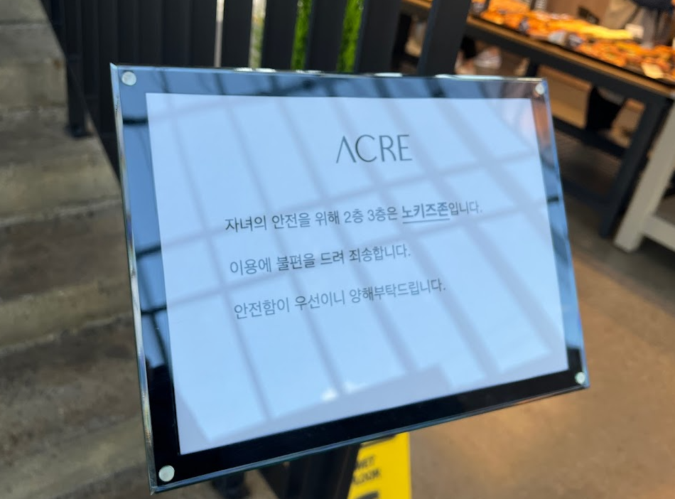 ACRE는 총 3층까지 있는데요. 1층을 제외한 2층과 3층은 노 키즈존이라고 합니다. 계단이 높아서 아이들이 다칠 수 있겠어요. 안전함이 우선이니 양해를 부탁한다고 합니다.